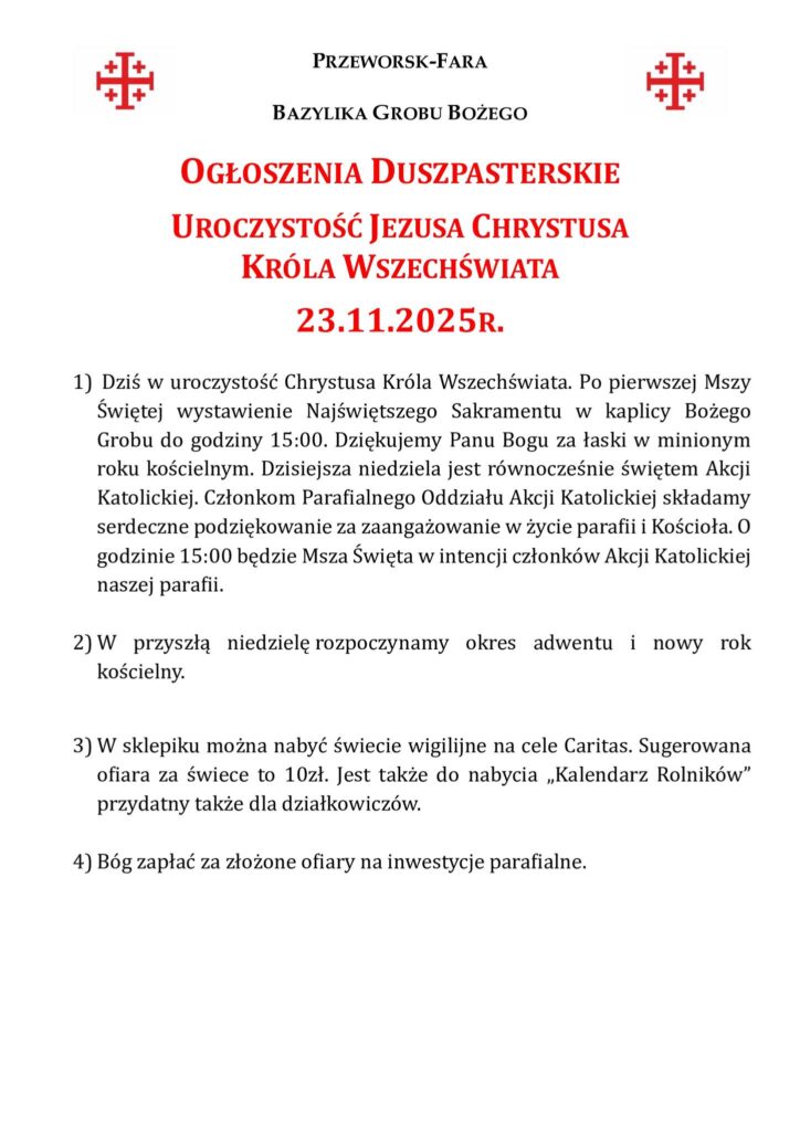 Uroczystość Jezusa Chrystusa Króla Wszechświata 23.11.2025